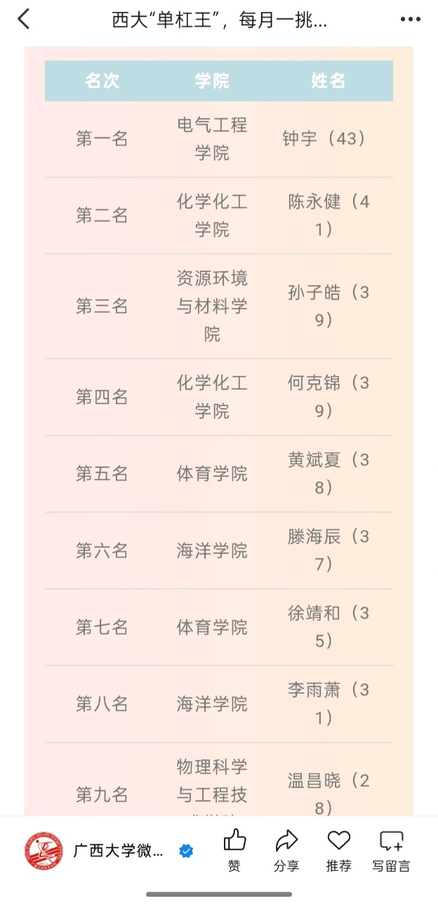 ok138cn太阳集团529首届 “单杠王”挑战赛于3月27日开赛,该活动每月开展一次竞技比拼。电自235班钟宇同学在3月、4月的挑战中分别获得第一名、第二名;研234班郑圣祺同学获得4月挑战赛的第十名,展现电气学子良好的精神风貌。