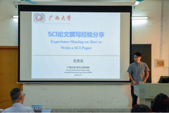 范贤浩博士从自身读博经历出发,在文献检索及管理、研究型论文基本结构、提升论文质量方法、期刊投稿流程这几个方面给同学们分享了他的经验。在第二部分“研究性论文基本结构”中,他着墨最多,详细介绍了论文撰写每一部分的要领和注意事项,并结合自己研究领域检索到的相关论文举例说明。其他部分中,范贤浩博士也分享了一些主要的信息检索和文献管理工具、英文论文语言润色的网站和技巧、论文排版和绘图细节处理的软件和窍门等经验。范贤浩博士干货满满,流畅而不失幽默的讲演,使大家听得全神贯注,现场气氛热烈。研一同学纷纷表示拓展了学术视野,开阔了自身眼界。