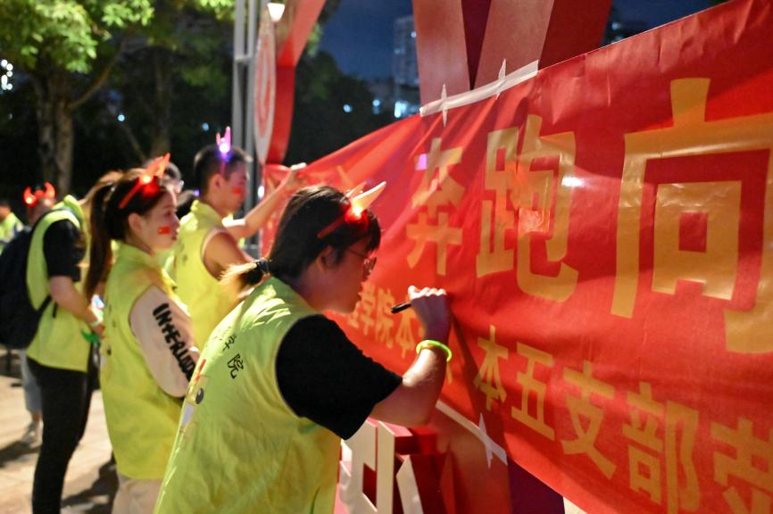 稍作休整,再出发。同志们前往西综合楼,纷纷在横幅上写下对党最真诚的祝福:“永远跟党走”“青年强则国强”“青春不停,随党前行”“学习党的二十大,一起向未来”……一句句振奋人心的寄语饱含着青年党员们的家国情怀,以及坚定不移听党话、矢志不渝跟党走的决心。