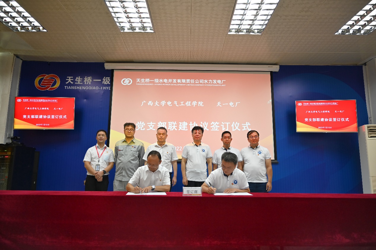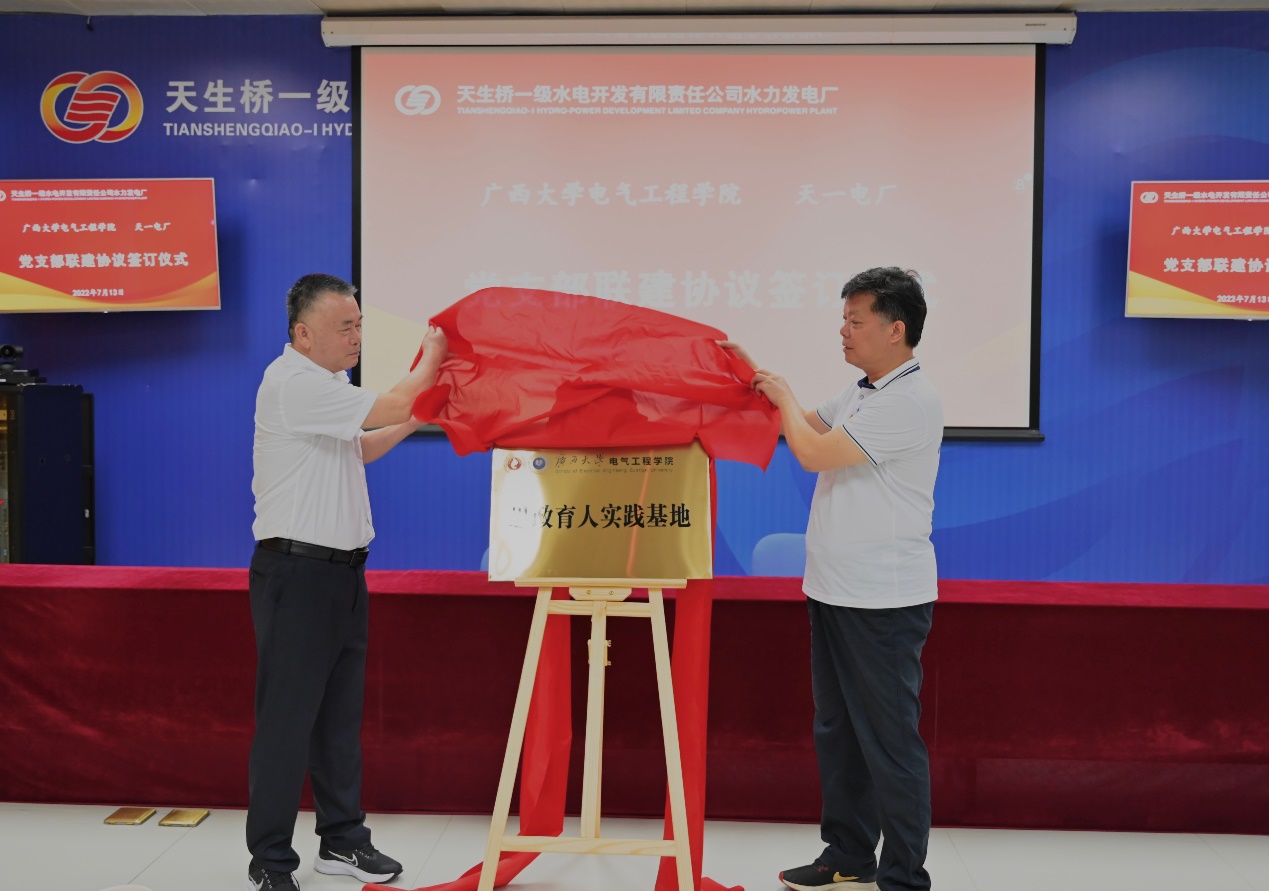 在天一电厂,ok138太阳集团古天乐电气党支部与天生桥一级水电开发责任公司水力发电厂党支部举行党支部联建签约仪式和揭牌仪式。两个党支部充分发挥各自的优势和特点,在党建工作框架下开展人才培养、科研合作、实习实践、文化建设等活动,促进基层党建工作特色化、制度化。社会实践团观看了天一电厂成立20周年宣传片,在厂房学习和实践,了解企业发展历史和“卓越之道,天人合一”的企业文化,学习天一电厂支部建设先进经验与企业管理的创新做法。