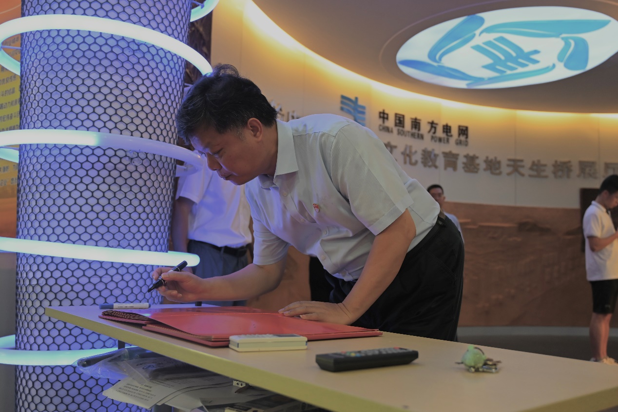 在天生桥局讲解员的引导下,师生一行走访学习了南方电网超高压输电公司企业文化教育基地天生桥展厅,观看了“筑梦桥头堡,奋进新时代(天生桥局20年发展,为祖国70周年华诞献礼)”的纪录片,对我国西电东送的发展历程有更进一步的了解。最后,梁志坚书记应工作人员要求,代表社会实践团在展厅签名留念。
