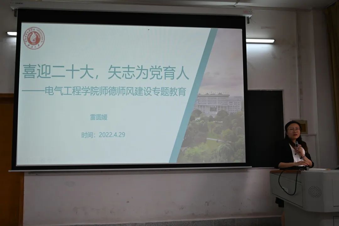 学院党委副书记、纪委书记雷圆媛以“喜迎二十大,矢志为党育人”为主题,开展“师德师风”建设专题教育。雷圆媛副书记结合习近平总书记关于“师德师风”的重要论述以及《ok138cn太阳集团529教师失德失范行为处理办法》,详细解读我校师德负面清单,以生动案例给全体教职工上了一次形象生动的“师德师风”教育课,引导广大教师时刻自重、自省、自警、自励,努力打造具有政治素质硬、业务能力精、育人水平高的高素质教师队伍。