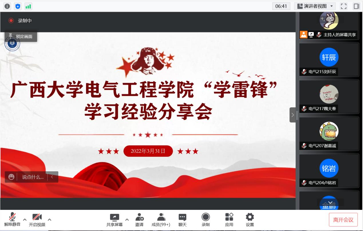 3月31日晚,我院以线上线下相结合的方式召开了“学雷锋”学习经验分享会,本次会议分为学习方法指导、“学长学姐有话说”、“解惑答疑”三个环节。我院覃思老师,卢泉老师,殷林飞老师就如何高效掌握课程知识进行学习方法指导。创培181班隆承雨,电自188班王延州,创培191班周璐梅、范协洋、赵泽辰,自动化192班李秋君作“学长学姐有话说” 的经验分享,全体2020级、2021级本科生参加会议。
