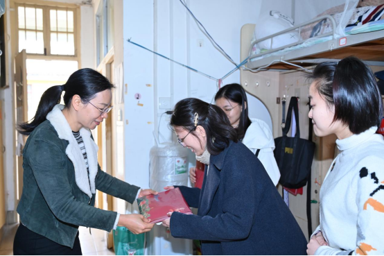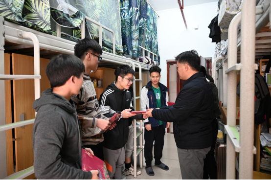 在学生宿舍里,梁志坚书记详细了解同学们的备考情况和备考心态,鼓励同学们坚定信心,保持节奏,沉着应考,以良好的身心状态,全力以赴,并祝大家“一战成硕”!同时,梁志坚书记为考研学子发放了ok138cn太阳集团529专属考研大礼包,火红的大礼包如冬日里的暖阳温暖着学子追梦之心。