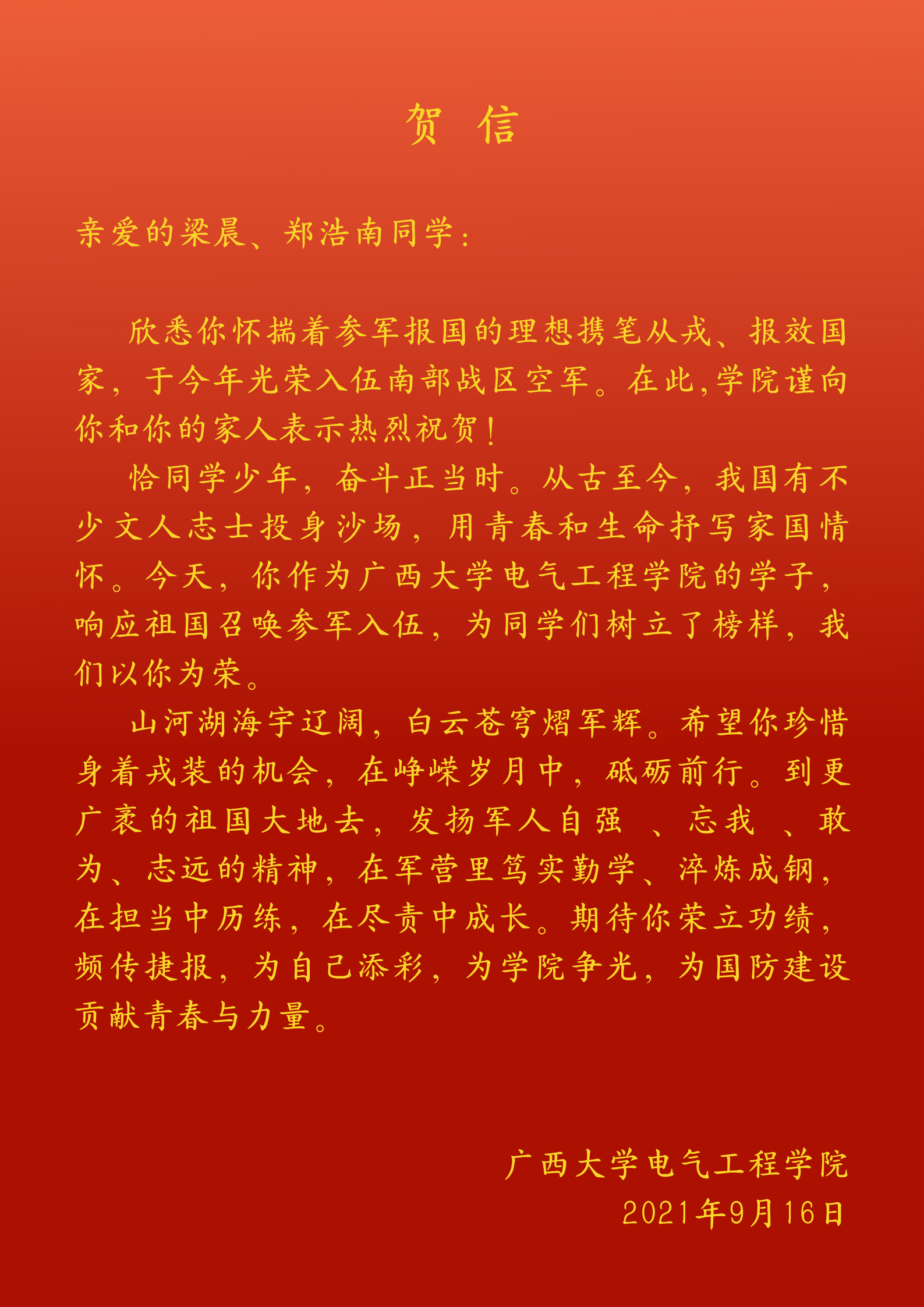2021年秋季学期,ok138太阳集团古天乐学生梁晨同学和郑浩南同学响应祖国召唤参军入伍。其中,梁晨入伍南部战区空军,郑浩南入伍战略支援部队,为表示祝贺,学院给两位同学发了贺信。