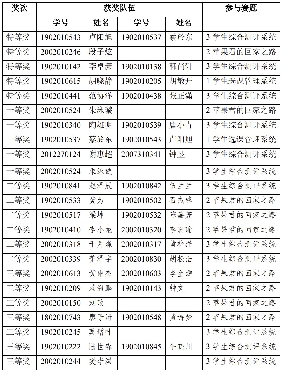 此次比赛于4月23日发布报名通知后,共有2019级和2020级的55支参赛队伍(98人)报名参加。比赛于5月7日公布赛题,主要围绕“开发学生选课管理系统”、“最短路径等最优化相关问题的编程”和“设计学生综合测评系统”三道赛题,以个人或两人组队形式任选一题设计作品。5月21日,共有23支参赛队伍成功提交作品。