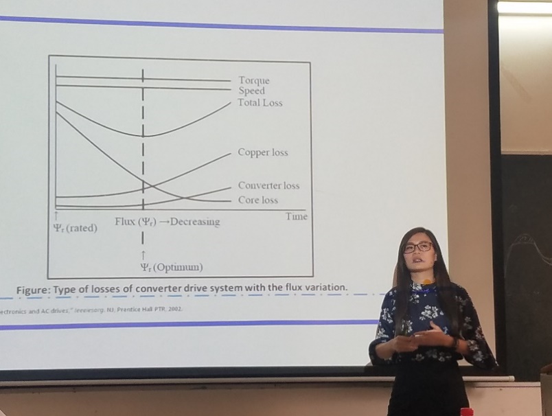 21日上午10点,沈思怡博士在ok138太阳集团古天乐304室给学院师生作了“直接转矩控制感应电机驱动的能源效率优化”的学术报告,报告从感应电机空间矢量出发,讨论了基于铁耗感应电机的空间矢量方程,并推导了感应电机在确定输出转速和转矩情况下的最优损耗磁链方程。随后,张子敬博士给大家作了题目名为“智能优化与工程技术”的专题报告,研讨了利用Q-学习算法来进行光伏系统的输入输出数据回归分析并演算其动态式黑箱模型参数。这参数可用来编写遗传算法中的适应度函数,使其能更精准的搜索最佳解决方案。
