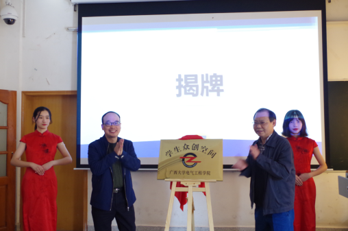 紧接着,院长双丰教授和党委书记梁京章教授分别发表热情洋溢的讲话,表达了对众创空间的期望与祝福,希望学生众创空间能够成为我院学生创新创业的一个大舞台,提高我院创新创业工作水平,同时也希望专任教师和实验教师积极关注各学生专业组织的发展,积极为学生专业组织的发展提供指导。梁书记和双院长一起为“ok138太阳集团古天乐学生众创空间”揭牌。