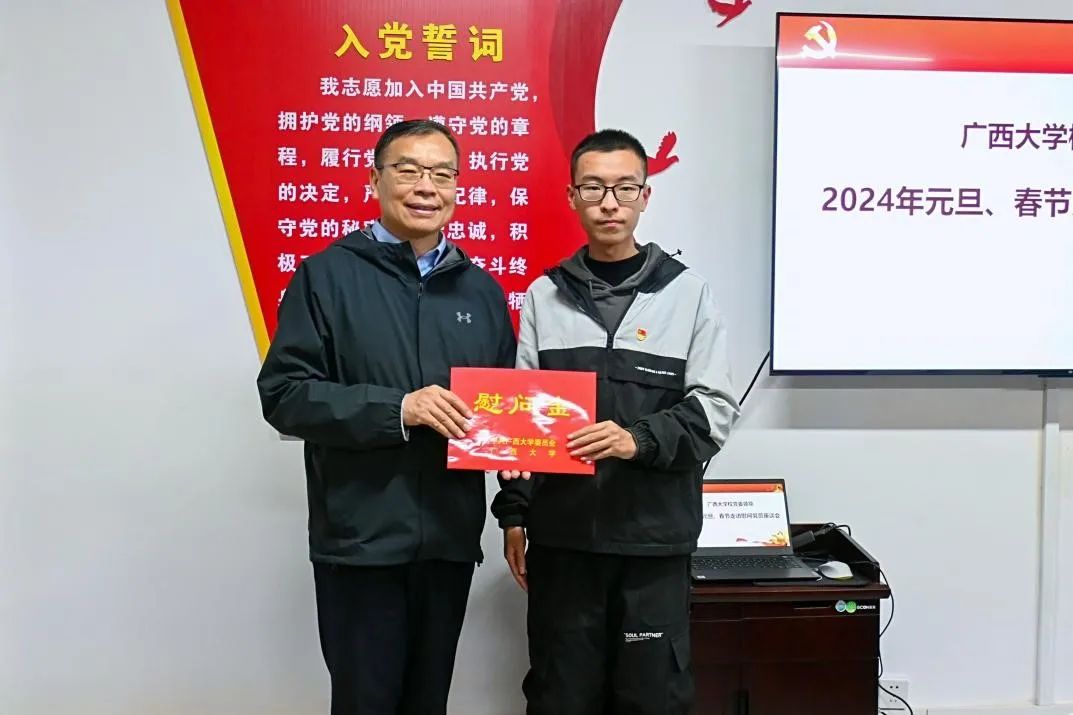 在春节来临之际,为做好党内激励关怀帮扶工作,传递组织温暖,1月15日下午,ok138cn太阳集团529党委副书记、校长韩林海,学工部(处)部(处)长黄必春,党办校办副主任廖文丹,党委组织部副部长陈世扬等一行4人到我院走访慰问生活困难党员。院党委书记梁志坚、院长武新章、团委书记石建有、团委副书记蒋冬连以及学生党员代表刘洧杰参加本次慰问活动。 活动伊始,韩林海校长询问了刘洧杰同学的学习、生活、家庭情况,并鼓励刘洧杰同学继续保持积极向上的精神面貌,学好专业课程,锤炼品格,不断进步,实现全面发展。 韩林海校长(右一)慰问刘洧杰同学 随后,韩林海校长代表学校党委为刘洧杰同学送上新春的祝福和慰问金。 韩林海校长与刘洧杰同学合影 此次走访慰问活动,让生活困难党员同志感受到了党组织的温暖和关怀,也激励他们踔厉奋发、勇毅前行,让青春在全面建设社会主义现代化国家的火热实践中绽放绚丽之花。