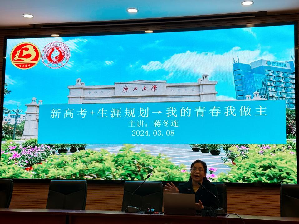 与企业的交流结束后,我院一行在百色高中举行了职业生涯规划指导讲座。学院团委副书记蒋冬连老师作为主讲人,给百色高中2021级四百多名高三年级学生做题为《新高考+生涯规划→我的青春我做主》的讲座。她从高考综合改革概况、“生涯规划+志愿填报”的融合、我的青春如何由我做主等多方面展开宣讲,同时结合ok138cn太阳集团529特色和优势宣传ok138cn太阳集团529,受到在场学生的热烈欢迎,现场气氛活跃。