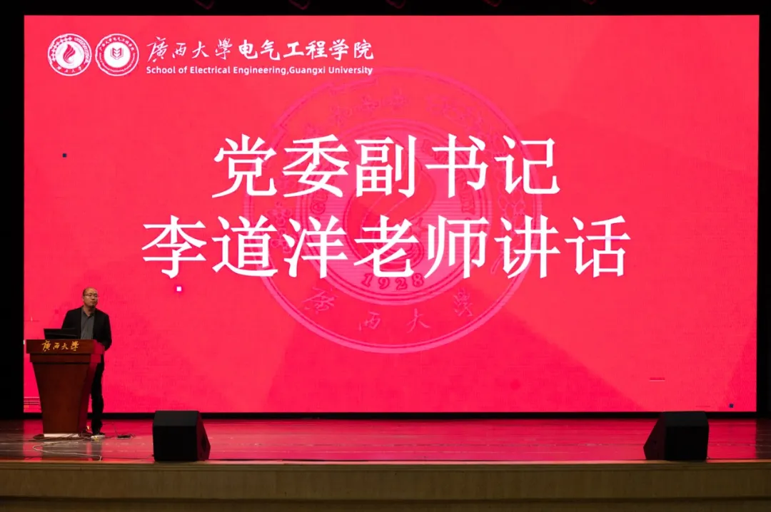 为加强学生素质教育,帮助同学们进一步了解专业分流概况,3月20日晚,我院在大礼堂举办2022级本科生年级大会暨专业分流大会。学院院长武新章,党委副书记李道洋,副院长李畸勇,电气工程系主任陈碧云,自动化系主任李修华,团委副书记蒋冬连、李勇(兼),教务秘书黄广业,辅导员李楠、何惠榕及2022级电气类专业本科生参与本次大会。会议由2022级辅导员何惠榕主持。