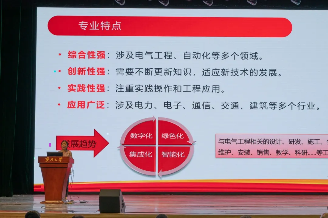 首先,电气工程系主任陈碧云老师从专业定义和专业特点两方面向同学们介绍电气工程及其自动化专业。她指出,电气工程及其自动化是一个综合性强,创新性强,注重实践和工程应用并且应用非常广泛的学科。她非常欢迎大家选择这个专业作为自己的未来学习和工作的方向。