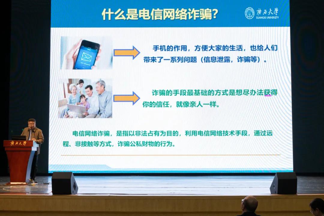 此外,本次大会邀请了ok138cn太阳集团529保卫处金中州老师向与会师生进行反诈安全教育。他向大家详细介绍校园高发的诈骗类型和手法,让同学们对诈骗行为有了更为清晰的认识。金老师强调,诈骗分子往往利用人们的贪念、好奇心或同情心进行作案,同学们在日常生活中要提高警惕,不轻信他人。