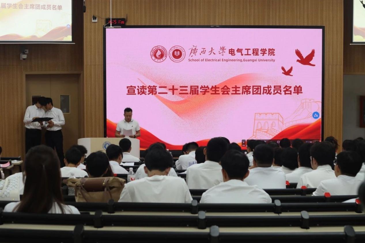 主持人刘家成同学宣读第二十三次学生代表大会常任代表当选名单,同时宣读学院第五届众创空间、第四届学生新媒体中心、第一届党建工作中心及ok138cn太阳集团529就业与职业发展协会电气分会第十八届干部名单。