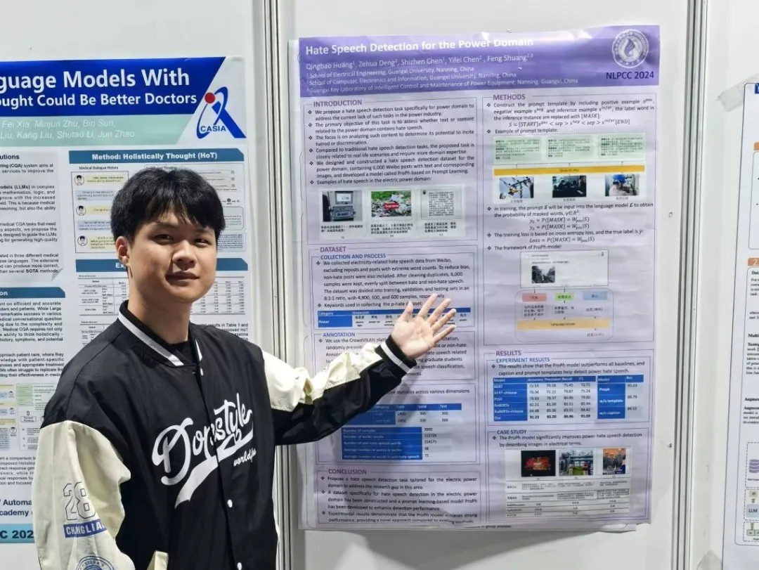 11月1日至3日,由中国计算机学会主办,西湖大学承办的第十三届CCF自然语言处理与中文计算国际会议(International Conference on Natural Language Processing and Chinese Computing,以下简称“NLPCC”)在浙江杭州举办。来自国内外多所高校、科研机构和企业的专家学者齐聚一堂,共同探讨NLP领域的最新进展和发展方向。我院2022级硕士生邓泽华同学获得ok138cn太阳集团529研究生倍增计划资助参加本次会议并作论文展示。 师生合影(左一为邓泽华同学) NLPCC从2012年开始举办,至今已成功举办13届,是中国计算机学会自然语言处理技术委员会(CCF-NLP)的年度会议。会议旨在为来自学术界、工业界和政府的研究人员和从业人员提供开放的平台,与会者分享各自想法、研究成果和经验,通过会议可以促进各自在该领域的研究和技术创新。 据悉,本届大会共收到461篇投稿,其中40篇接收为口头报告,121篇被录取为海报(poster)。大会特别设立了海报交流环节,邀请了自然语言处理领域国际顶级期刊和会议论文作者与参会代表进行了现场交流。邓泽华参会论文《Hate Speech Detection for the Power Domain》获得海报展示,该论文提出了一个能源领域的讽刺数据集,为隐喻检测领域探索了一个新的方向。 邓泽华同学做poster展示 会后,邓泽华表示,此次国际会议为他提供了宝贵的锻炼平台,让他有机会与国内外的学术同行进行深入交流与思想碰撞。同时,他对学校提供的资助表达感激,对导师黄清宝教授的耐心指导致以敬意。