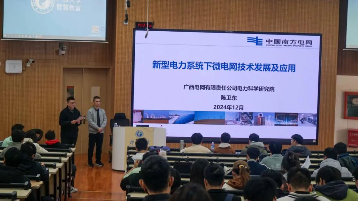 为提升我院学生工程应用与实践能力,了解当下学科前沿,助力其成长成才,12月13日下午,由我院主办,ok138cn太阳集团529电力系统最优化研究所、我院团委、研究生会、学生会承办的第2期“行业大咖进课堂”暨电气工程学科前沿讲座在东10A-305举行。广西电网公司电力科学研究院智能电网研究所副经理、高级工程师、三级领军专业技术专家陈卫东受邀到我院为师生们作题为“新型电力系统下微电网技术发展及应用”的讲座。我院2024级电气工程专业全体博士、硕士研究生,部分本科生,共计300余人参与活动。本次讲座由电气工程系副主任代伟副教授主持。 陈卫东老师以讲述“新型电力系统的特征”为着力点展开,结合李立浧院士对当下新型电力系统的十大新技术的思考先是介绍了广西电网负荷变化趋势,随后介绍微电网的发展情况和形式架构。 在对微电网控制技术的介绍中,陈卫东老师先讲述了结合p-f控制和下垂控制的相关技术模拟传统同步电机和简单电力系统的一次调频切入主题,然后正式介绍基于虚拟同步发电机(VSG)的微电网控制技术,并介绍了变换器参与控制一次调频的基本原理。最后,陈卫东老师结合广西电网的微电网实证平台,向同学们演示并讲解了微电网群并网、离网和运行状态转换等实验。 在交流与答疑环节,在座的老师同学们就微电网控制和运维、电科院研究概况等问题向陈卫东老师请教,陈卫东老师耐心地解答了同学们的疑惑。在场的同学们纷纷表示受益匪浅,对未来的研究与发展有了更明确的方向。 此次“面向新型电力系统的虚拟电厂关键技术及应用”讲座让同学们了解了新型电力系统的发展情况、微电网的控制与运维和虚拟电厂的相关概念,鼓励同学们树立远大理想和奋斗目标,为未来科研发展奠定了坚实的基础。