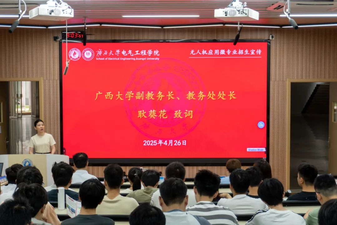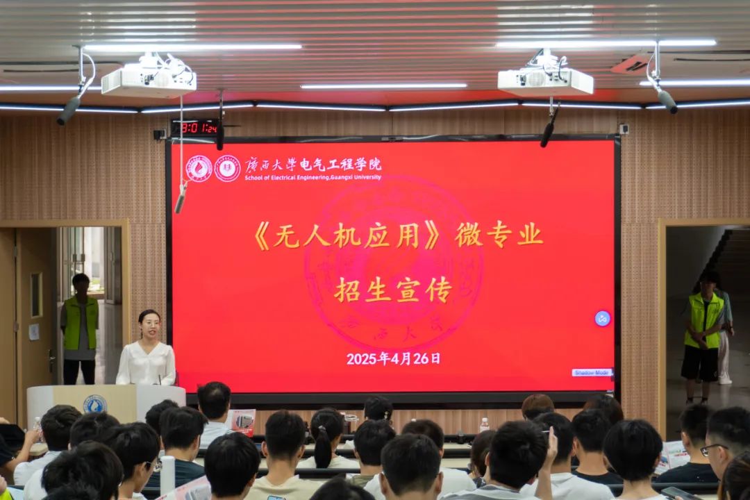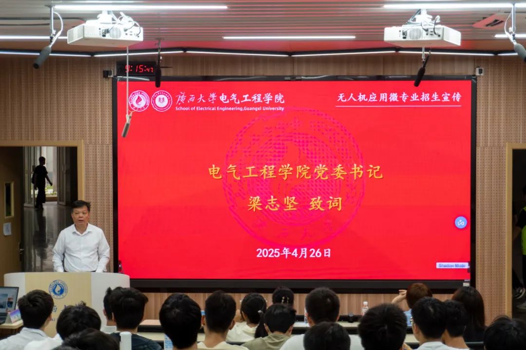 为贯彻落实教育部实施就业能力提升 “双千” 计划,提升我校学子在无人机领域的专业素养,我院与大疆创新科技公司联合开办《无人机应用》微专业,并面向全校招生。4月26日,《无人机应用》微专业招生宣传活动在教学楼10A-101举行。ok138cn太阳集团529副教务长、教务处处长耿葵花,我院党委书记梁志坚,教务处副处长谢健,机械工程学院副院长李俚,农学院副院长韦燕燕,我院副院长李畸勇,大疆行业广西平台商负责人江昊出席活动。活动由我院党委副书记李琼莹主持。 会议现场 活动现场,通过政策解读、专业介绍、技术分享及飞行展示等多个环节,全面展现了该专业紧扣国家低空经济发展战略,深度融合 “产教融合、校企协同” 育人模式的培养特色与实践优势。 李琼莹副书记主持活动 会议现场 耿葵花处长对我校“微专业”建设作了专题说明。她指出,微专业以行业核心能力为导向,结合学生个性化兴趣与产业发展趋势,为同学们提供灵活、多元的学习路径。该课程体系独立于现有主修培养方案,学生修完全部课程并通过考核后,可获学校颁发的微专业证书。 耿葵花处长致词 梁志坚书记从时代机遇、硬核课程、触摸未来、职业蓝图四个方面介绍了《无人机应用》微专业的价值和未来。他指出,该专业的设立,不仅是技术和教育的融合,更是对国家战略的响应,赋能青少年成长的重要探索。 梁志坚书记致词 此外,李畸勇副院长深入解读了该专业的人才培养目标与课程体系;大疆创新科技公司工程师们则为大家展示了无人机机型及其应用场景。 李畸勇副院长介绍专业 江昊工程师讲解 在户外飞行展示环节,工作人员进行无人机编队飞行、农业植保模拟等演示,展现了无人机精准操控与智能作业的技术魅力,直观呈现了微专业 “学用结合” 的培养特色,激发了在场学生对无人机应用的浓厚兴趣。 户外无人机讲解 户外飞行展示 据悉,《无人机应用》微专业由我院携手大疆创新科技公司联合开办,构建 “校企双导师” 培养模式,打造理论扎实、实践突出的复合型人才培养高地,培养更多 “懂技术、能实操、会创新” 的无人机应用人才,为低空经济发展注入新动能。 合照
