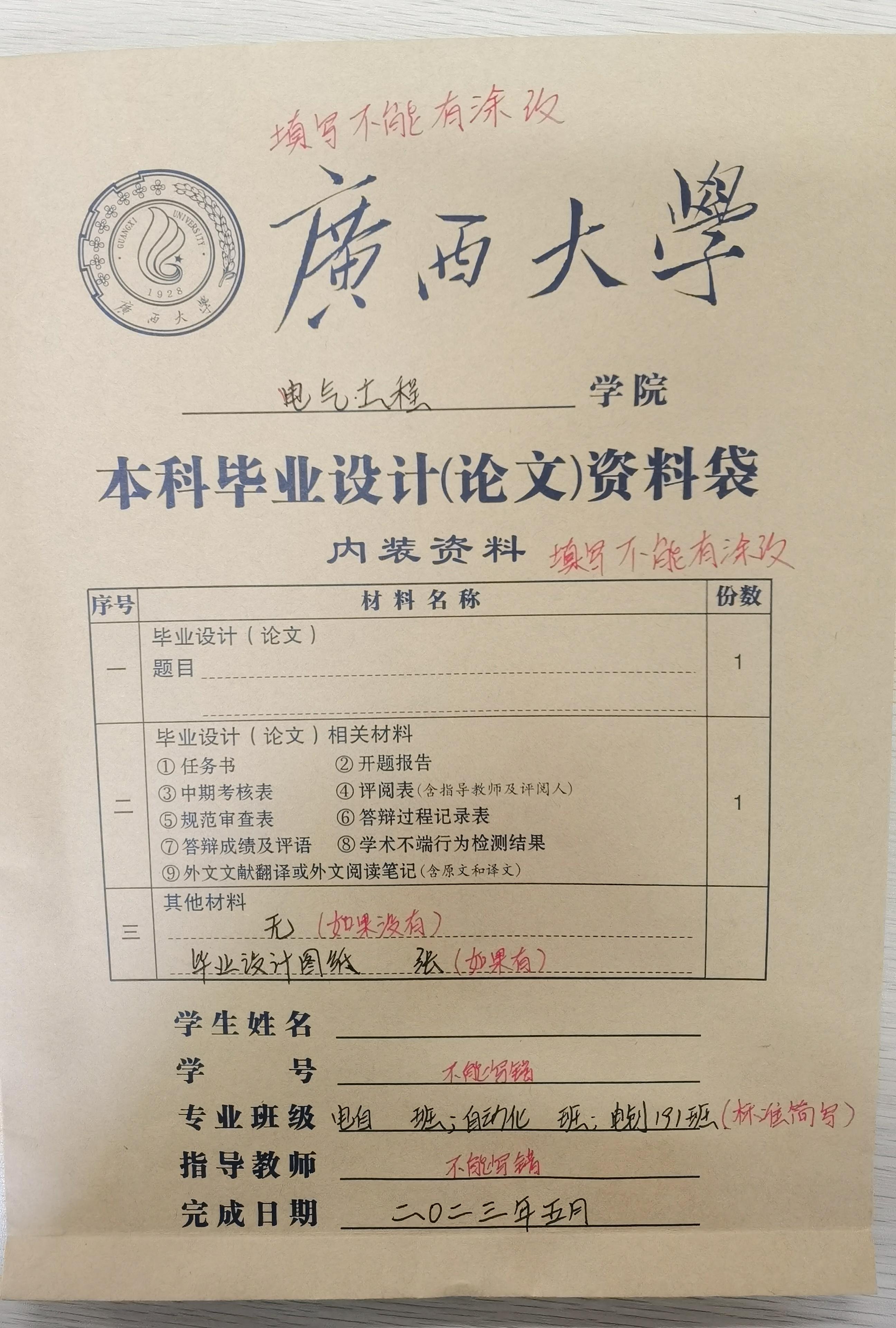 2、由导师收齐后,发给教学秘书,文件夹命名为:2023届本科毕设归档材料(2019级)+导师姓名。发送到20050072@gxu.edu.cn、或QQ私发。
