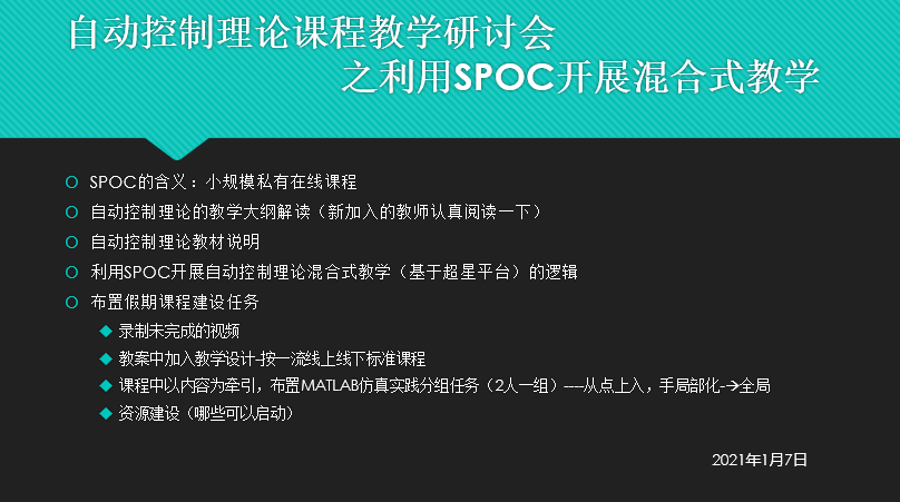 为顺利开展2021-2022(2)学期自动控制理论课的教学,2022年1月7日上午10点在学院312召开了关于自动控制理论课程利用SPOC开展混合式教学的教学研讨会和培训会,会议讨论了春季学期开课全体任课教师如何采用SPOC开展教学,特别是胡立坤老师就前期探索中遇到的问题与大家进行了交流,同时初步布置了假期课程建设的任务。会议会对ok138cn太阳集团529慕课平台如何高效使用进行了培训。