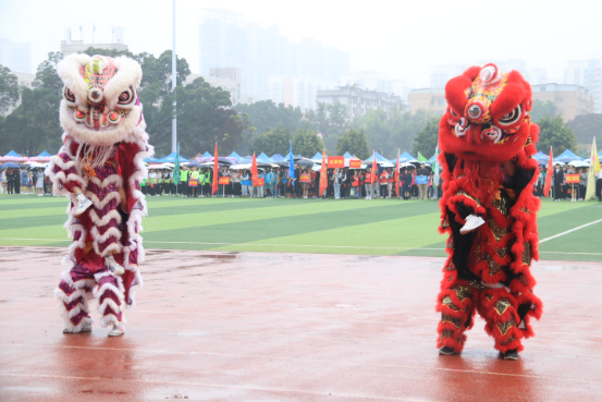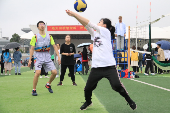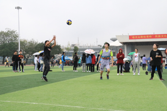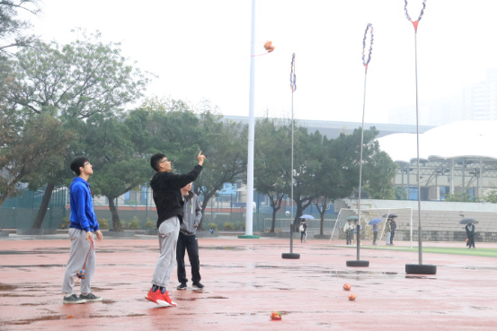 雨天,篮球场的地面潮湿,但是仍然阻止不了同学们参与活动的热情