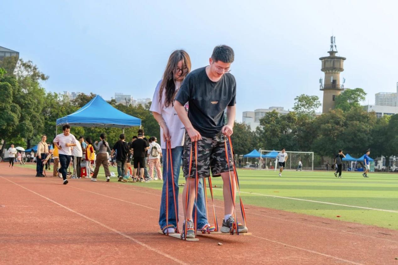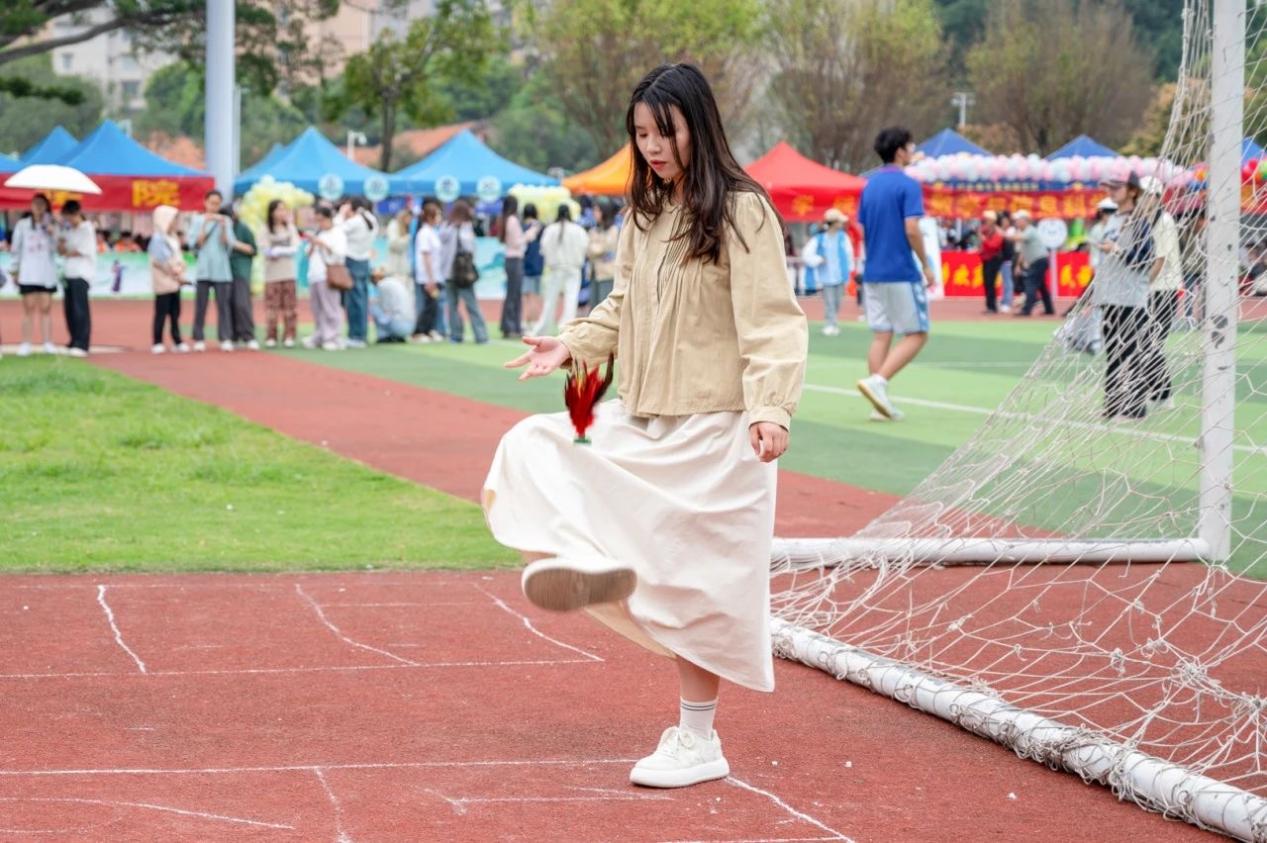 在趣味运动会的现场,我院学子奋力拼搏,团结协作,最终收获快乐与胜利。在踢毽子比赛中,选手边维持平衡边根据毽子位置挪动步伐。