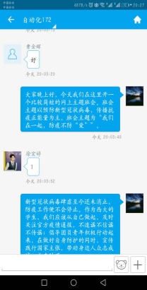 自动化172班:本班主要是通过易班“我们在一起,防疫不防爱”主题班会学习。主要是以预防新型冠状病毒,传播抗疫正能量为主,号召同学们积极配合防疫工作,做一名优秀的大学生。此次班会:首先是倡导团员青年们积极行动起来,听从学院的安排。其次,一线的无数白衣战士日夜浴血奋战,可歌可泣的英雄故事值得我们去传颂。大家都表现出极大的积极性,纷纷表示在易班的微社区发表相关话题支持抗疫人员,多去了解习近平总书记关于疫情的重要讲话。最后,希望大家都自律学习,在家保持良好的生活学习状态。大部分同学表示听从学校“停课不停学”的安排,准时准点开始学习。此外,我们还整理了一些资料供大家学习,让大家了解我们的国家,我们的党做了什么,感知国家的力量、人民的真情,涵养时代青年爱国爱党的美丽情怀和齐家治国的责任担当!