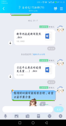 电自173班:在班长和团支书带领下,同学们通过手机、电脑、电视等途径了解了疫情的情况,并且对自己学习到的内容开展了讨论。同学们学习到的内容多种多样,有的同学在人民网、央视网等网站上阅读了多篇有关习近平总书记关于抗击疫情工作的重要讲话和指示精神。比如全面提高依法防疫依法防控能力,抓紧抓实抓细防控疫情工作,健全国家公共卫生管理体系,协助推进新型冠状肺炎科研攻关等重大决策。有的同学阅读和分享了诸多抗击疫情期间涌现出来的英雄人物的故事,比如84岁仍旧出山为抗击疫情奉献的钟南山院士,身患渐冻症仍坚持奋战在抗疫一线武汉金银潭医院院长张定宇等。学习之后,同学们在班级群里展开了热烈的讨论,发表了自己的看法。同学们为国家遭受危难时展现出来的大爱无疆的精神而感动,为中国作为世界大国面对危机时临危不乱的气度感到自豪,为一位位抗战在一线的人们的英勇无畏的精神而折服,为中国能够度过这次难关充满信心。