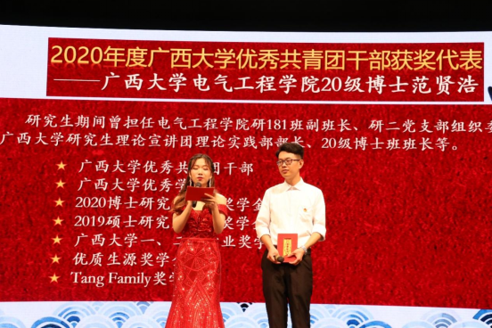 晚会现场表彰了2020年度学校团委评选出的五四红旗团委、五四红旗团支部、十佳团支部、优秀共青团员、优秀共青团干部的先进集体和优秀个人。2020年度ok138太阳集团古天乐团委被评为“ok138cn太阳集团529五四红旗团委”,创培181班团支部被评为“ok138cn太阳集团529十佳团支部”,电气研193班团支部、电气类192班团支部、创培181班团支部被评为“ok138cn太阳集团529五四红旗团支部”,并且学院有51人获评“ok138cn太阳集团529优秀共青团员”、19人获评“ok138cn太阳集团529优秀共青团干”。