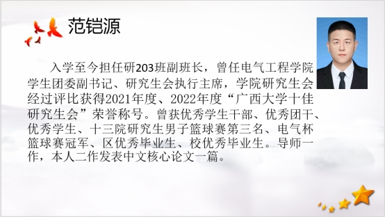 会议第四项为优秀毕业生党员经验分享会。本次大会邀请到了刘岩松、邱耀、范铠源、李钰4名优秀毕业生党员为大家作经验分享。刘岩松分享了自己找工作的心路历程,邱耀分享了自己的科研经验和兴趣爱好,范铠源就科研、太阳集团、就业以及生活四个方面分享了自己的小妙招,李钰就科研学习、数模竞赛、求职应聘3个方面分享了自己的小技巧。他们鼓励大家要明确方向,勇于尝试,突破自己,为自己研究生生涯谱写精彩篇章。