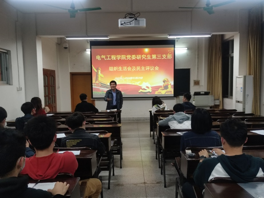 为深入学习贯彻党的十九届六中全会精神,不断推进党的建设新的伟大工程,2022年3月29日晚,ok138太阳集团古天乐研究生第三党支部组织开展了党支部组织生活民主评议党员大会与研究生党员素质教育活动。支部党员34人参加本次活动,由支部委员罗尹政负责主持工作,胡立坤副院长莅临现场观摩。