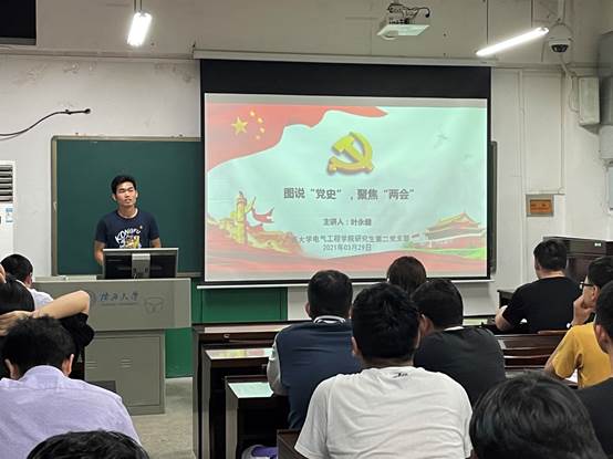 为贯彻落实习近平总书记在党史学习教育动员大会上的重要讲话和全国两会的重要指示精神,2021年3月29日晚,ok138太阳集团古天乐研究生第二党支部在电气楼201开展了一次主题为图说“党史”,聚焦“两会”的党日活动,学习百年党史,汲取奋进力量。研二支部书记徐俊华、支部委员叶永健、陈钊、李秀、刘经纬等全体党员参加活动。